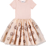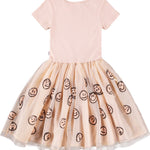 Vestido rosa de manga corta con falda de tul a juego con caras de lentejuelas. La parte superior es ajustada, confeccionada en jersey de algodón acanalado con cuello redondo, y la falda llega hasta la rodilla y tiene una enagua de algodón para dar más volumen.