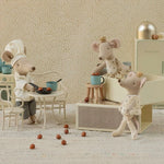 Conoce a los ratones gemelos reales, un dúo de hermanitos que viven en el castillo. Vestidos con sus mejores trajes de lunares y coronas doradas a juego, vienen acurrucados uno al lado del otro dentro de su propia cama en forma de caja de cerillas, digna de la realeza. Descansan sobre una suave manta con una pequeña almohada, listos para tener dulces sueños juntos. Cuando se despiertan, están listos para pasar horas jugando en el castillo antes de volver a acurrucarse en su caja a la hora de dormir.